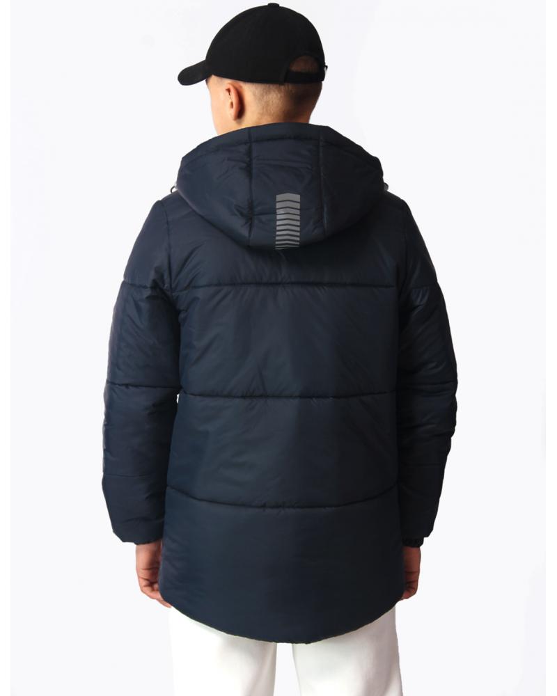 Особенности | Куртка для мальчика старшей школьной группы, утепленная. На переде по борту и переднему краю капюшона разъемная застежка-молния с ветрозащитной планкой, цельнокроеной с уголком молнии. На планку настрочена тесьма. По переду проложены строчки-стежки. На переде обработаны прорезные карманы с застежкой-молнией. На левую кокетку переда нанесена печать. Рукава втачные, одношовные с притачными манжетами, стянутыми эластичной лентой. На левый рукав настрочен шевроны. Капюшон втачной, двухшовный, с уступами. По лицевому вырезу капюшон стягивается эластичным шнуром, который протягивается через блочки и фиксируется фиксаторами. На среднюю часть верхнего капюшона нанесена световозвращающая печать. |