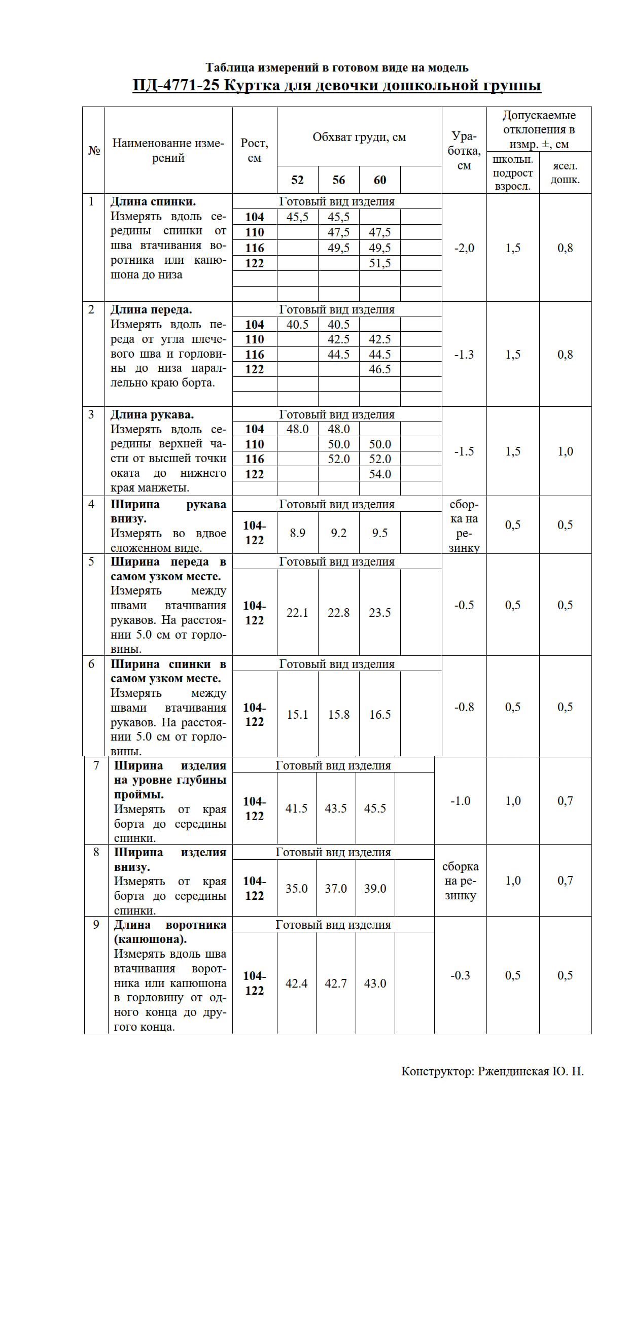 ОсобенностиКуртка для девочки дошкольной группы, утепленная. На переде по борту, переднему краю капюшона разъемная застежка-молния с ветрозащитной планкой, цельнокроеной с уголком молнии. На планку настрочена тесьма. На переде обработаны прорезные карманы с листочками с втачными концами. По входам в карманы установлены спец. закрепки. По боковым швам, внизу, вставлена световозвращающая тесьма (до надсечки). Рукава реглан, двухшовные, с притачными манжетами, стянутыми на эластичную ленту. Капюшон двухшовный, втачной, с уступами. Лицевой вырез капюшона стягивается шнуром, который продевается через блочки, фиксируется фиксаторами.