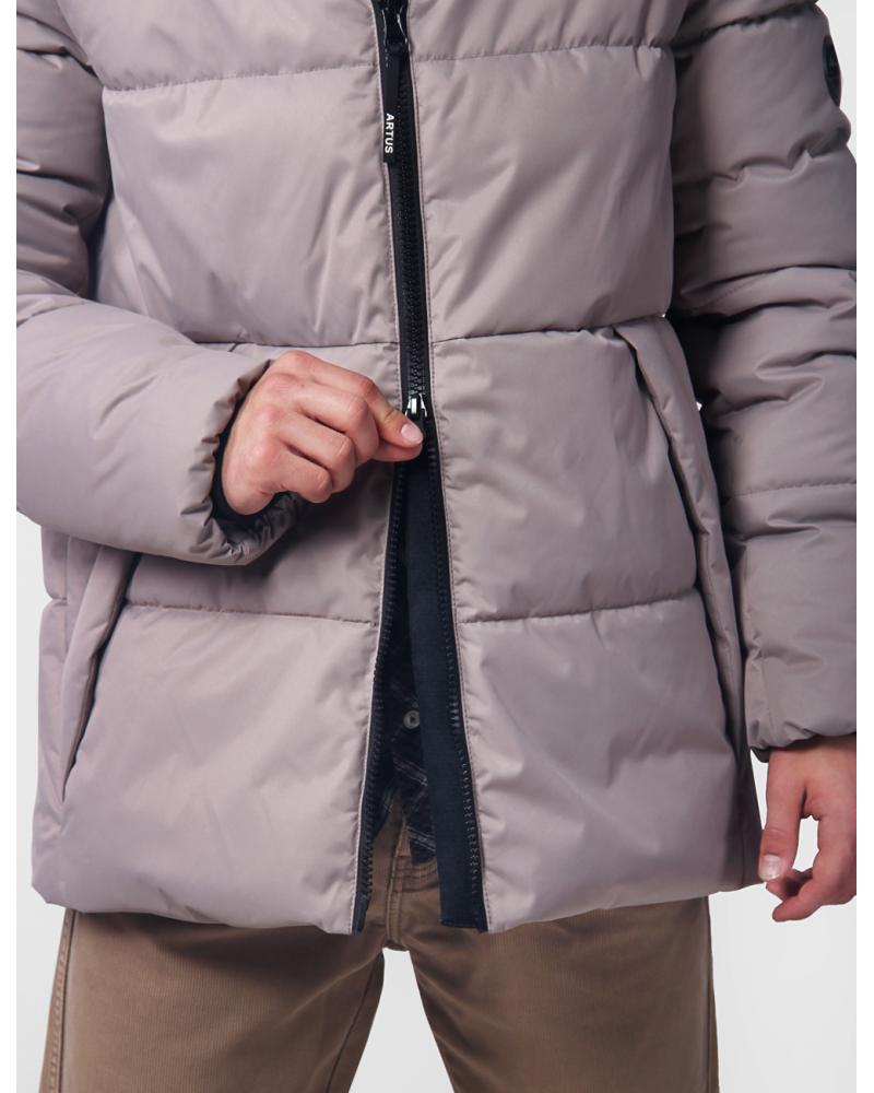 ОсобенностиКуртка для мальчика подростковой группы, утепленная. На переде по борту и переднему краю воротника - стойки разъемная застежка-молния с ветрозащитной планкой, цельнокроенной с уголком молнии. На планку настрочена тесьма. По верхним и нижним частям переда проложены строчки-стежки. На нижней части переда обработан боковой карман. По входу в карман установлены спец. закрепки. Нижний край боковой части переда отлетной. Нижняя часть спинки с переходящими от линии талии боковыми швами на перед. По частям спинки проложены строчки-стежки. В шов стачивания верхней и нижней частей спинки, между надсечками, вставлена световозвращающая тесьма. Рукава втачные, двухшовные, с трикотажными напульсниками. По рукавам проложены строчки-стежки. По низу рукава стянуты эластичной лентой. На верхний воротник нанесена печать. Капюшон двухшовный, втачной, с уступами, которые застегиваются на кнопку. Лицевой вырез капюшона стягивается шнуром, который продевается через блочки и фиксируется фиксаторами. Подкладка спинки из 2-х частей, с притачной полоской. В шве притачивания левого подборта обработан прорезной карман с застежкой-молнией. Вешалка из тесьмы. Рукава подкладки двухшовные. Бережная стирка при температуре 30 С.
