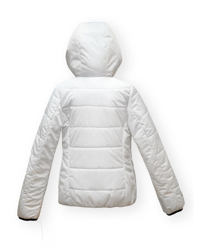 Центральная застежка-молния с ветрозащитной планкой, два боковых прорезных кармана, украшенные тесьмой с буквами, втачной капюшон, регулируемый с помощью широкой тесьмы, продетой через люверсы.