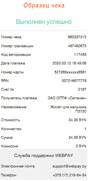 Система предоставляет возможность оплаты карточками международных систем VISA и MasterCard всех типов и БЕЛКАРТ. Передача данных осуществляется по отдельному каналу с применением современных методов шифрования. При этом исключается любая возможность перехвата конфиденциальной информации. Данные передаются в зашифрованном виде и сохраняются только на специализированном сервере системы "WEBPAY". Ваши персональные данные и реквизиты карточки вводятся не на странице нашего сайта, а на авторизованной странице платёжной системы. Доступ к этим данным осуществляется по протоколу передачи данных TSL, также применяются протоколы безопасных платежей