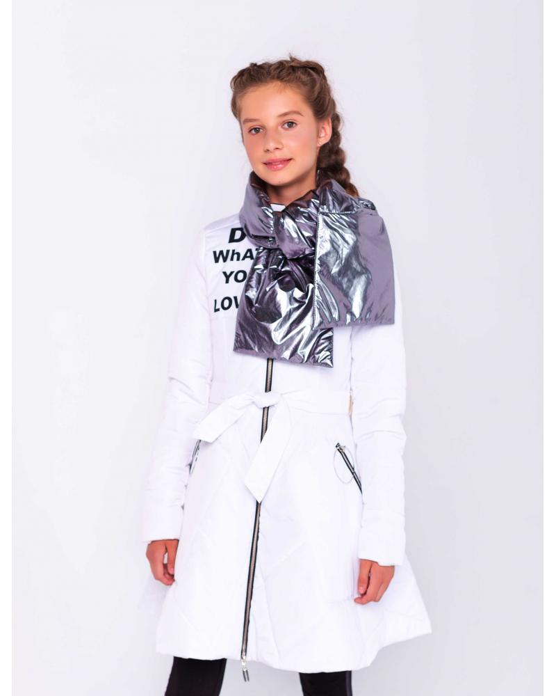Стильное пальто для девочки с пышной юбкой и серебристым шарфом придаёт романтизм и элегантность образу.