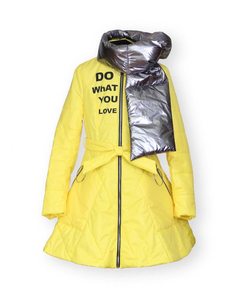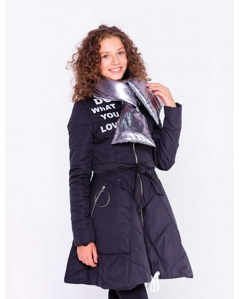 Центральная застежка-молния с ветрозащитной планкой, два боковых накладных кармана на молнии, воротник-стойка из флиса, съемный пояс, съемный шарф на молнии, на передней полочке куртки – буквенная печать «DO WhAT YOU LOVE» (Делай что ты любишь).